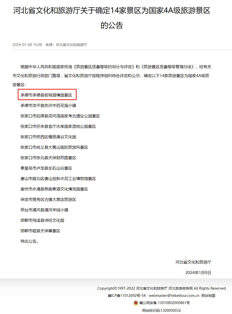 根據(jù)中華人民共和國國家標(biāo)準(zhǔn)《旅游景區(qū)質(zhì)量等級的劃分與評定》和《旅游景區(qū)質(zhì)量等級管理辦法》,經(jīng)有關(guān)市文化和旅游行政部門推薦,省文化和旅游廳按程序組織綜合評定,承德市承德縣板城酒博園景區(qū)被評選為國家4A級旅游景區(qū)。