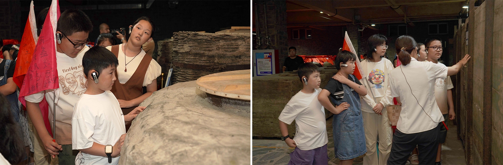 研學(xué)首站來到彌漫著酒曲氣息的慶元亨酒坊,孩子們近距離觀察窖池群落,聆聽“國家級非物質(zhì)文化遺產(chǎn)老五甑釀酒技藝”的釀酒原理。在恒溫恒濕的乾元酒窖,近距離觀察探索酒海、酒簍、陶壇交替儲存的奧秘,他們化身小小觀察員,分組協(xié)作,細(xì)致追蹤,在實(shí)踐記錄中深刻領(lǐng)悟糧食的珍貴與匠心。