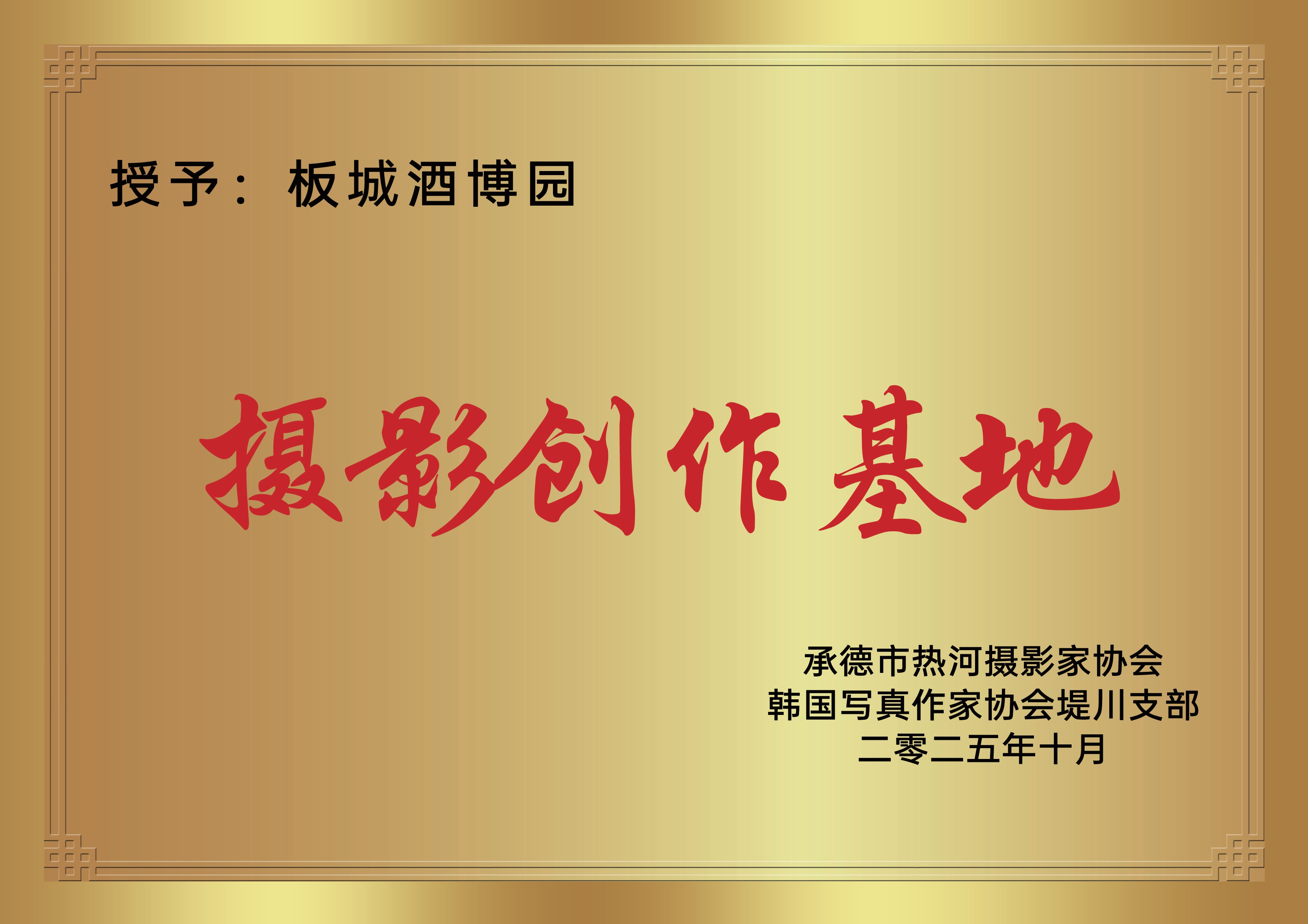 活動(dòng)現(xiàn)場(chǎng)由河北省攝影家協(xié)會(huì)副主席、市文聯(lián)名譽(yù)主席衣志堅(jiān),承德熱河攝影家協(xié)會(huì)主席楊利民與韓國(guó)寫真協(xié)會(huì)堤川支部長(zhǎng)金序潤(rùn)共同授予板城酒業(yè)“板城酒博園攝影創(chuàng)作基地”的殊榮。